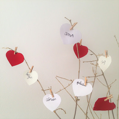 Para decorar a mesa, propus que escrevessem nuns corações de cartolina algumas palavras relacionadas com este dia, recortámos e penduramos na nossa Árvore da família.